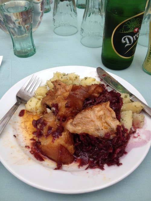 Like the idiot I am I have forgotten the name of the restaurant. All I can tell you is that it is on the top of Castle Hill in Buda. The meal itself was delicious. It consisted of pork, potatoes and red cabbage and washed down with a bottle of the local brew. Even better it was spent with good company with some of the people from the walk.