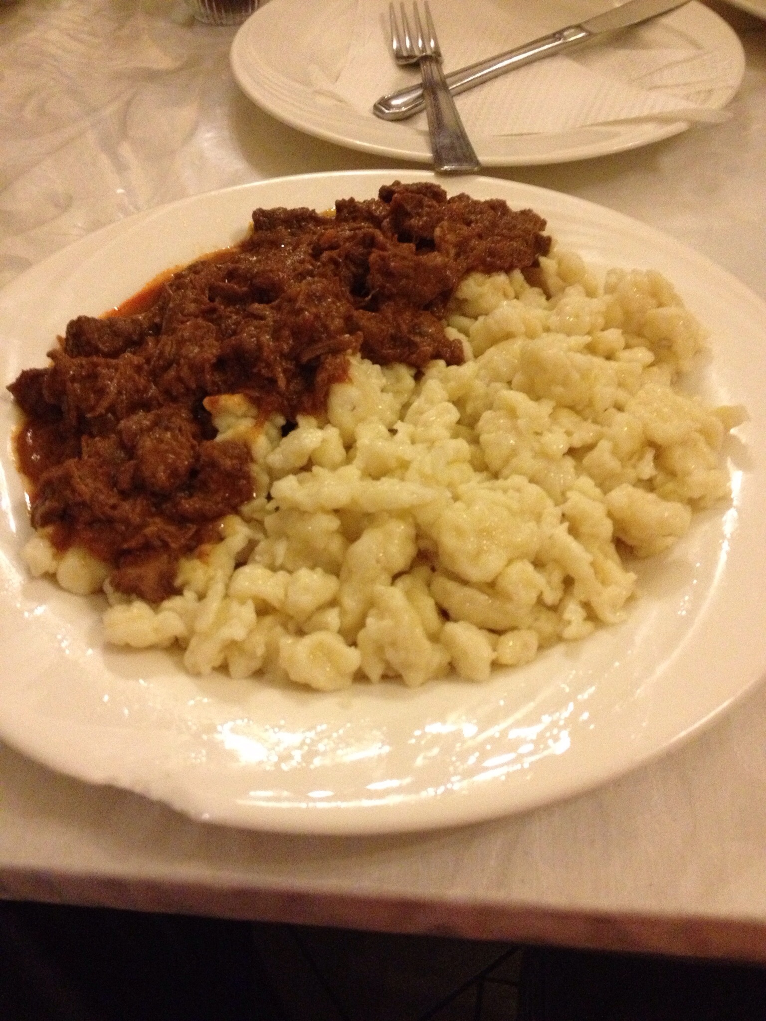 It took about fifteen minutes to walk to the restaurant from the hostel. We were welcomed by a good atmosphere, there were plenty of people already there. This is always a good sign. None decided to have a starter and went straight for the main course. Two of the party chose to order Chicken breast paprikash. Another ordered Mushroomgulash. I decided to order Beefgulash with red wine and noodles. It tasted delicious and costing 479ft I thought it to be excellent value too.